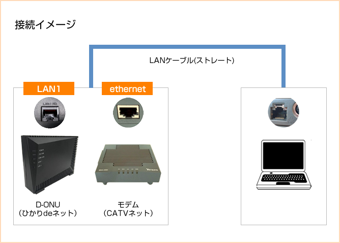 ONUのLAN1ポート(ひかりdeネット)またはモデムのPCポート(CATVネット)とパソコンをLANケーブルで接続します。