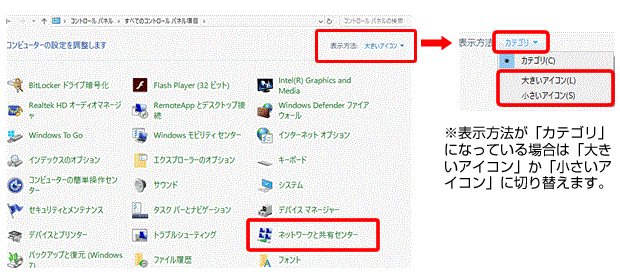 「ネットワークと共有センター」をクリックします。