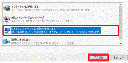 「ワイヤレスネットワークに手動で接続します」を選択して「次へ」をクリックします。