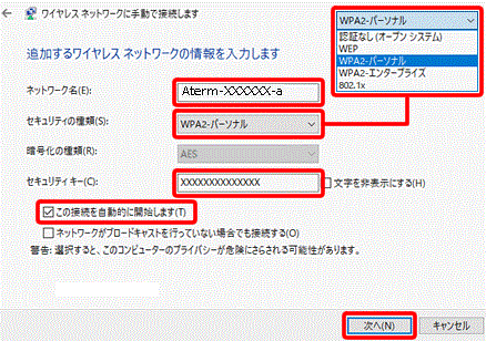 ※2種類の周波数(2.4GHz/5GHz)がある場合は5GHz(aterm-XXXXXX-a)を推奨します。