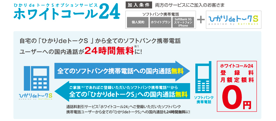 「ひかりdeトークS」※とソフトバンク携帯電話(個人契約・ホワイトプラン・Softbank3G)の両方のサービスにご加入のお客様。