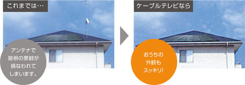 ケーブルで直接配信しているので、UHFアンテナもパラボラアンテナも必要なく、ご自宅の外観を損ねることもありません。ケーブルテレビなら暴風雨の時もアンテナが倒れる心配がなく安心です。