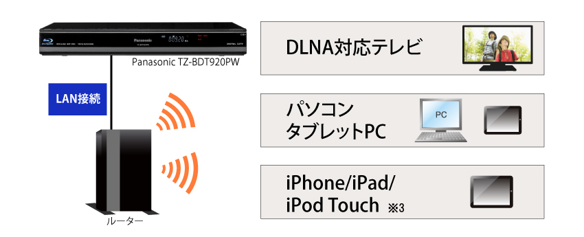 ファミ録ブルーレイ(TZ-BDT920PW)は無線LAN子機を内蔵し、無線LAN環境において配線の必要なく簡単にネットワーク接続ができます。