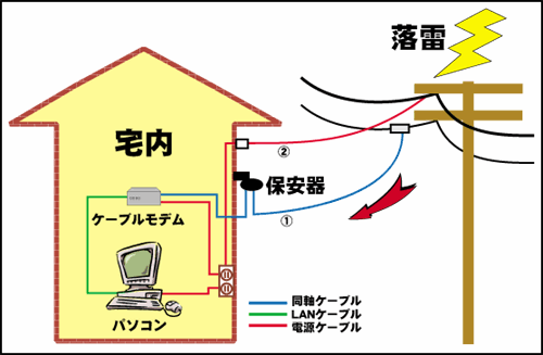 そのため、宅内の設備が、CATVの同軸ケーブルからの進入による雷被害を受けることはほとんど無く、落雷による被害の大半が、電源側からの雷サージによるものです。