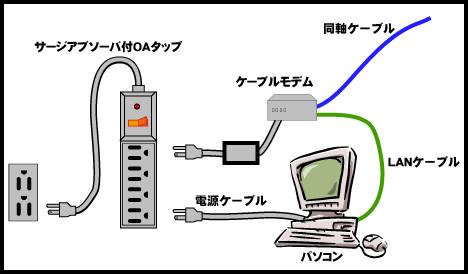 ケーブルモデムやパソコン等の電源コンセントを、「サージアブソーバ付OAタップ」に接続することで、雷サージによりケーブルモデムやパソコン等が破壊される確率を減少することが出来ます。(サージアブソーバ付OAタップは、パソコンショップなどでお買い求め頂けます。)